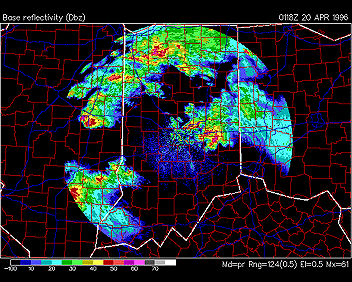 Radar ImageryIntroduction | Sending and Receiving Signals | Scattering of a Radar Pulse Radar stands for "radio detection and ranging." Radar images help meteorologists find precipitation. Radar sends a pulse of energy into the atmosphere. If the pulse strikes precipitation, some of the energy is scattered back to the radar. These returned signals are called radar echoes. When a number of them are grouped, you get a radar image. The radar image at right shows radar echoes over parts of Indiana, Ohio, and Illinois. The echoes point out where precipitation is falling. The colors indicate how strong the precipitation is. The color scale is in the lower left corner of the image. In this image several strong thunderstorms are moving through Illinois and Indiana on April 20, 1996. Light and dark blue regions indicate lighter precipitation. Red and pink regions show strong to occasionally severe thunderstorms.